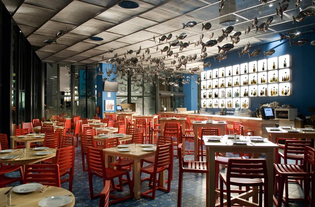 Shoal (Zaragoza, Spain) L19m Suspended installation of 300 blown metal fish in the Mexican government's pavilion for the International Expo for Water and Sustainable Development (mirror polished stainless steel)